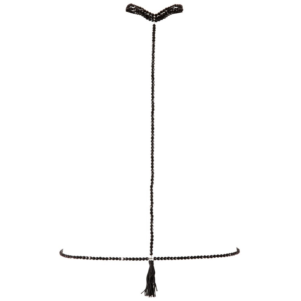Three rows of stretchy pearls that go around the neck â they are attached to the bikini chain by a further chain that can be fastened with a small snap hook at the back. There is a small tassel over the stomach.