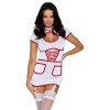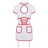 Short semi-transparent white dress in nurse style by Cottelli COSTUMES, with contrasting red details. Fitted and elasticated model with half sleeves and a daring neckline. Includes two front pockets and a mesh insert under the decorative bow. High collar with two buttons at the neck. The suspenders are adjustable and completely removable.