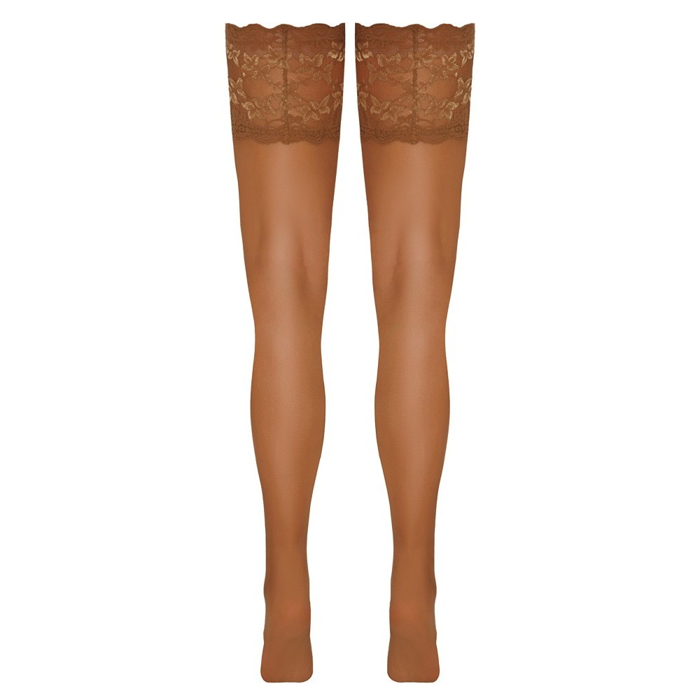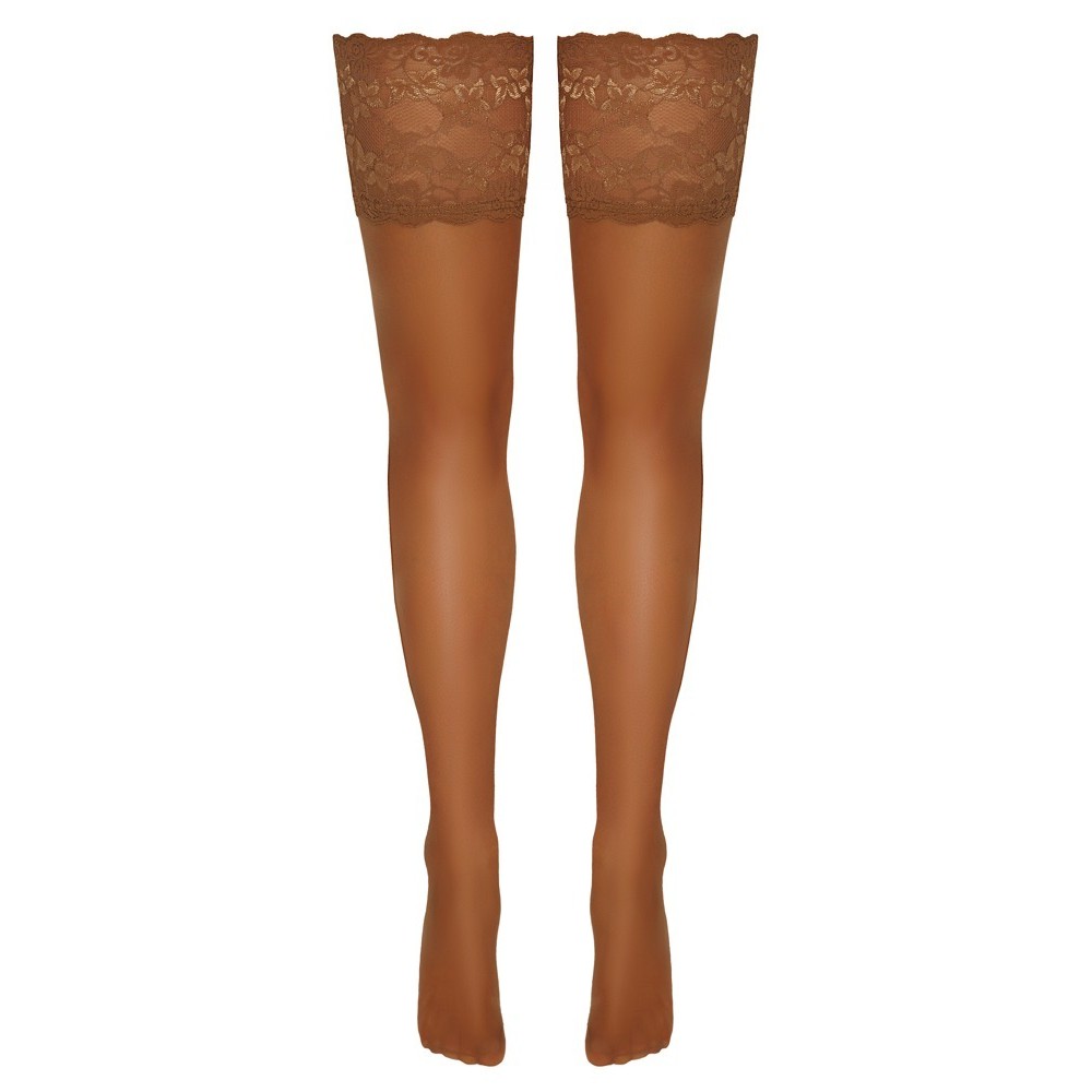 Lightweight, skin-tone hold-up stockings by Cottelli LEGWARE, with a 14 cm wide lace trim. Silicone-reinforced inner band for a non-slip fit and optimal support. 20 denier. Oeko-Tex certified. Lace designs are subject to change.
