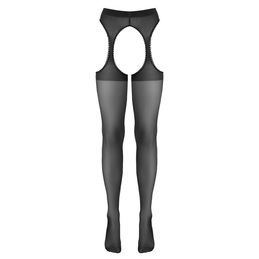 Black tights by Cottelli LEGWARE with a garter belt effect, decorative seam at the back, crotch opening and delicate lace trim at the sides. Pre-formed feet. Thread weight 20 den. Oeko-Tex certified.