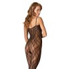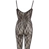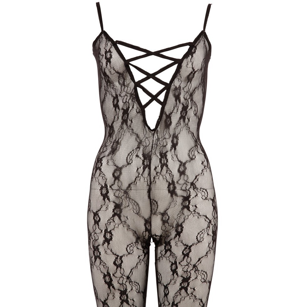 Black lace bodystocking with a pattern that seductively wraps around the body, with an open bust and adjustable Velcro strap at the centre of the neck. The design includes an opening at the crotch and integrated feet, creating a look that is both provocative and elegant.