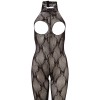 Black bodystocking in smooth lace that seductively wraps around the body, with an open bust and adjustable Velcro strap at the centre of the neck. The design includes an opening at the crotch and integrated feet, creating a look that is both provocative and elegant.