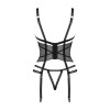 The black Lanelia corset combines sexy translucent mesh with an open-cut bra, adjustable straps and garter straps, a silver pendant on the bust and a hook fastening at the back. Includes a thong with an open crotch for an even more provocative effect and stretchy, pleasant-to-the-touch material.