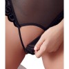 This black powernet string teddy is simply fantastic, as it allows you to be naked in an instant! The cups can be easily unbuttoned from the velvet straps and padded underwired bra. This way, the breasts can be completely uncovered, making this string bodysuit perfect for a private strip show. The thong part can also be unfastened, giving access to your most intimate area. It features rhinestone decoration on the neckline, a hook fastening at the back and adjustable straps. The cups and the area around the legs feature a snowflake print.