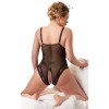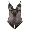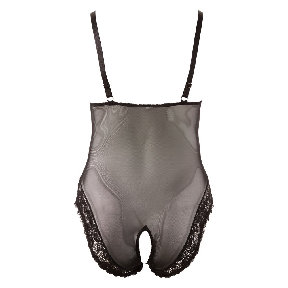 This elegant black polyester bodysuit beautifully enhances the silhouette. The cups and leg area are adorned with lace, while the open crotch and adjustable straps ensure a perfect fit.