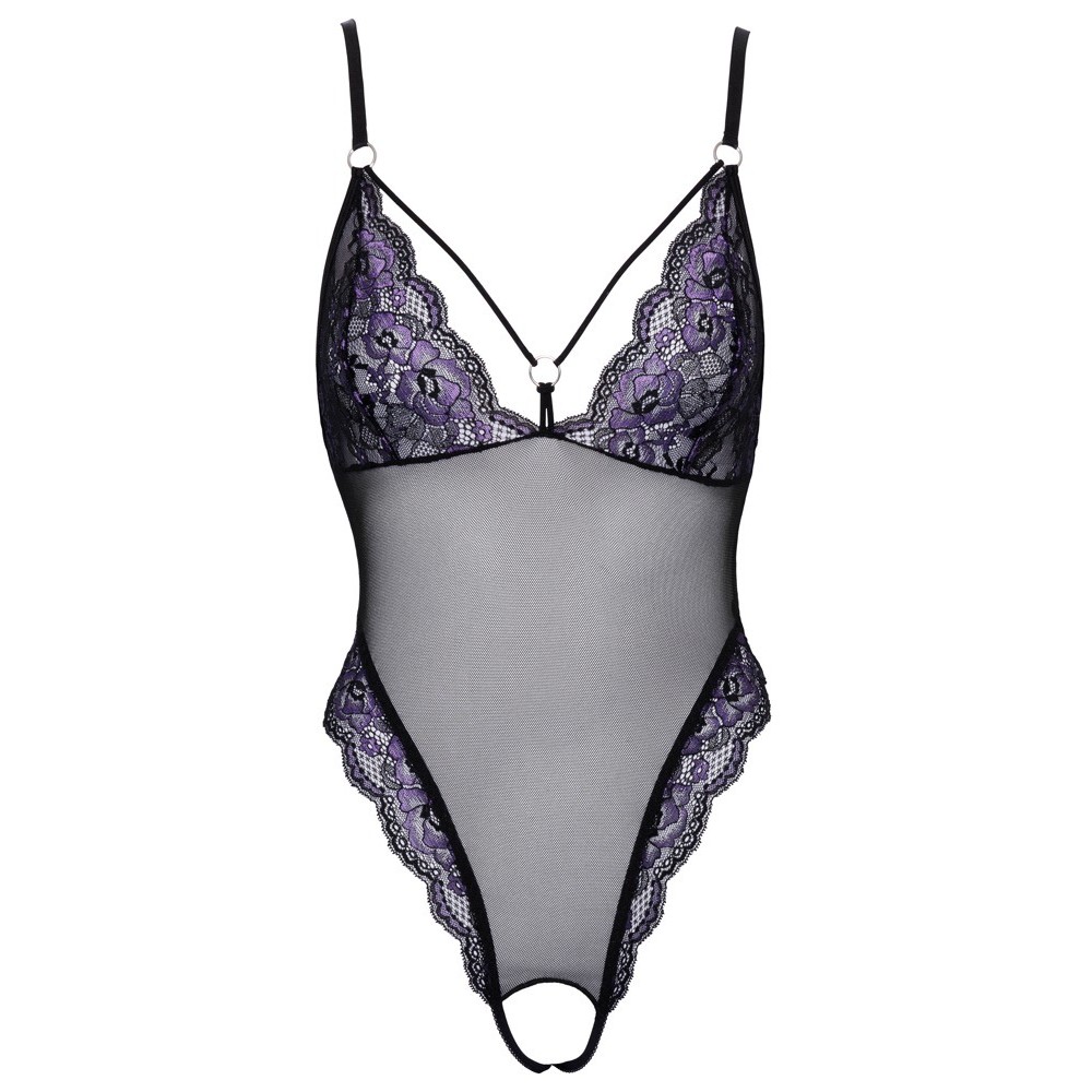 This elegant teddy from Cottelli LINGERIE is made of delicate powernet and floral lace in two colours. The floral lace emphasises the wireless cups and high legs. Soft and elastic, it guarantees exceptional comfort. The elastic straps are joined at the neckline by a ring and are adjustable. Two elastic straps decorate the open crotch.