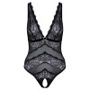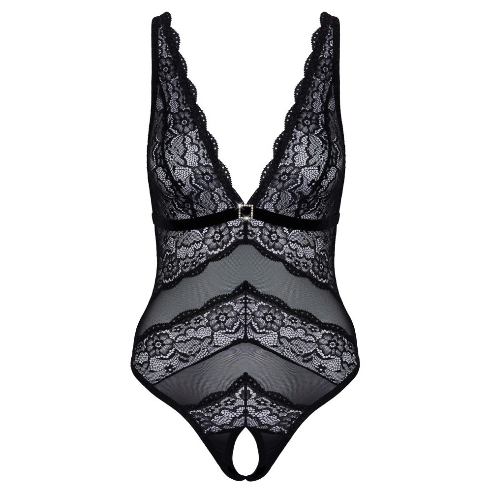 Strapless teddy by Cottelli LINGERIE, in a delicate combination of powder fabric and floral lace. Elegant deep neckline with rhinestone detail under the velvet bust band. Seductively open crotch. Powernet fabric back with adjustable hook fastening. The straps are also adjustable for a perfect fit.