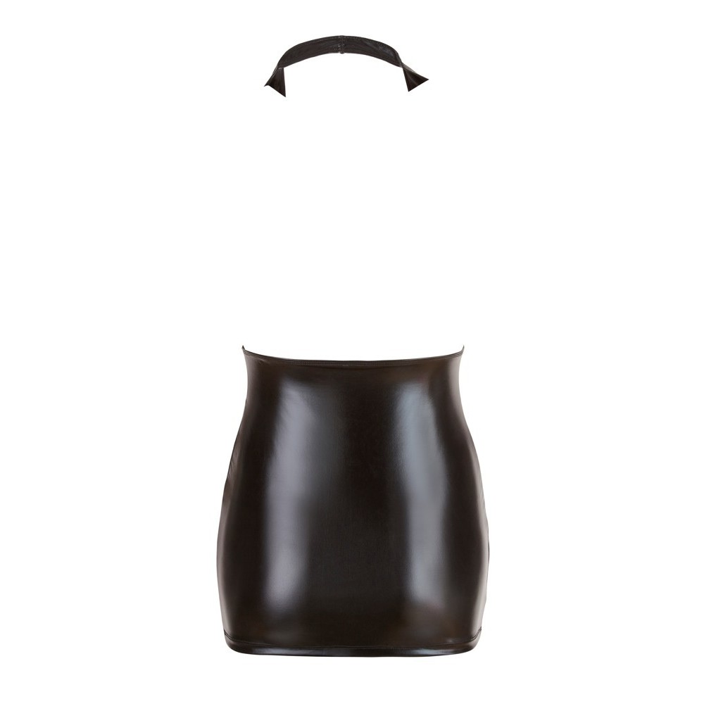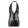 Fitted wetlook dress with a plunging neckline and completely bare back, with halterneck straps.
