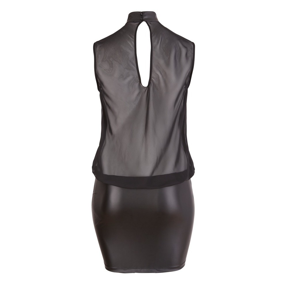 Lightweight and loose-fitting black mini dress with a sheer, sleeveless top that flatters the figure. Small cut-out at the back and high neckline with two buttons, contrasting with the opaque, fitted skirt that highlights the feminine curves.