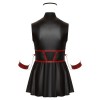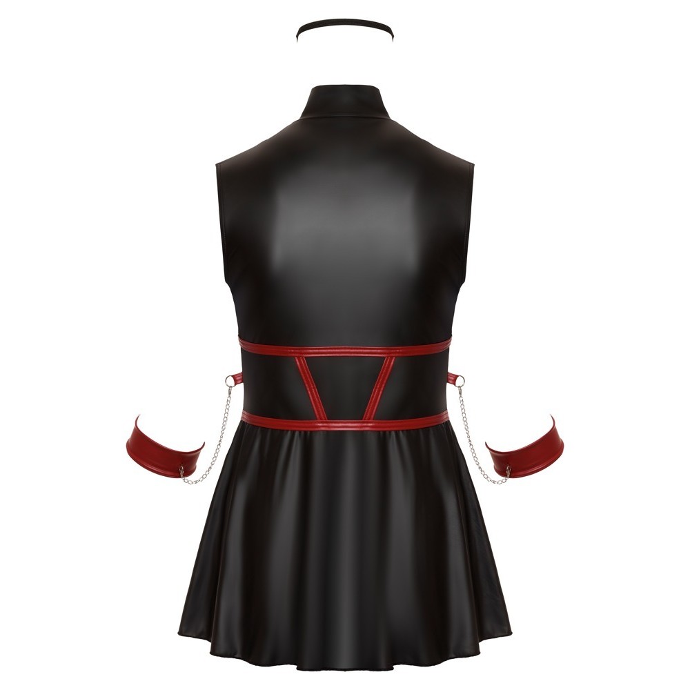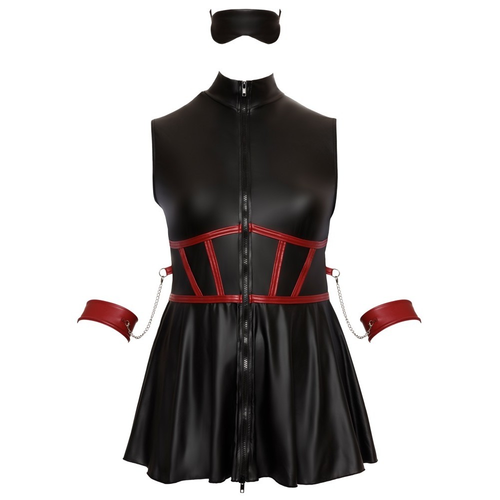 Short sleeveless dress from Cottelli BONDAGE PLUS, with a tight fit and slightly flared skirt. Made of stretchy material in an elegant matte black finish, with contrasting red stripes on the bodice that accentuate the waist. At the front, it has a two-way zip along the entire length, which can be opened from either the high collar or the hem. On each side there is a ring for attaching the soft handcuffs included, equipped with chains and snap hooks. The handcuffs are adjustable thanks to the hook and ring fastenings. The set also includes a slightly padded, completely opaque eye mask, perfect for moments of play and seduction.