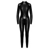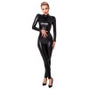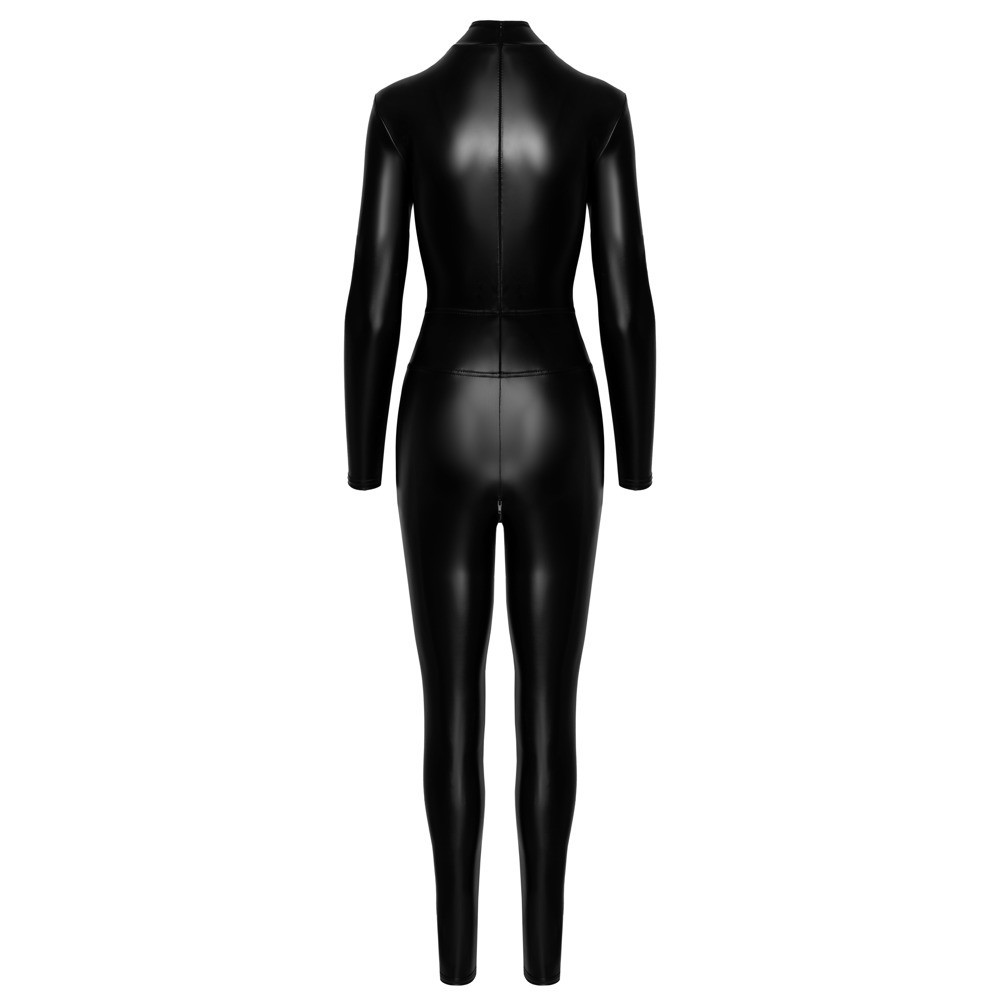 The Noir jumpsuit is made from black power wet-look fabric and fits like a second skin. The soft, stretchy material offers extreme comfort. Form-fitting, it features a high neck, long sleeves, long legs and a zip at the back. It features a large decorative ring at the front, ideal for a leash, ties or accessories, discreet zips over the breasts and a zip at the crotch, combining practicality with allure.