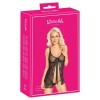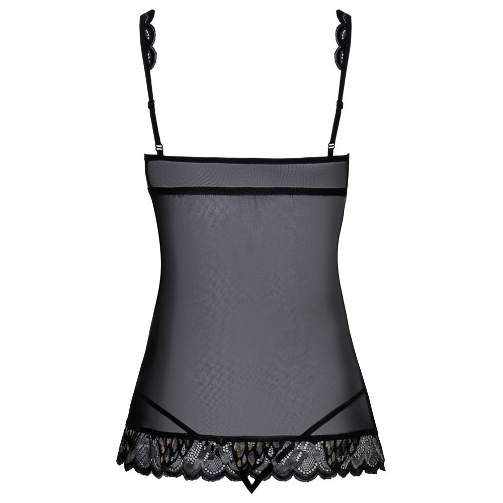 Kissable set consisting of a short chemise and matching thong. The nightdress is made from delicate powernet and elegant, soft and stretchy lace for a comfortable fit. The design opens at the front and fastens with a hook-and-eye closure discreetly hidden under a decorative satin bow. The underwired cups and adjustable straps ensure perfect support and fit. The small thong, also in delicate lace, stands out for its seductive design with two thin, elastic straps that meet at the crotch.