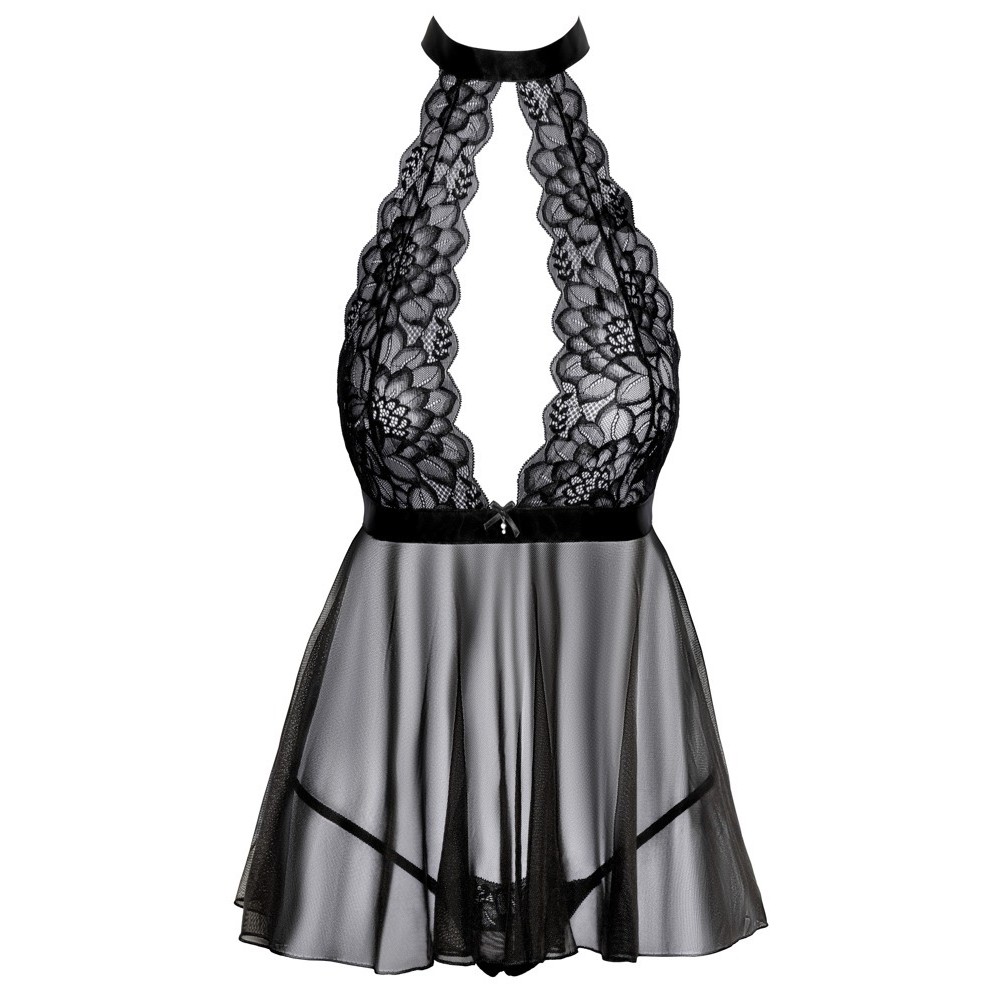 Short, flowing chemise by Kissable, made from beautiful sheer black lace (top) and delicate powernet fabric (skirt). Silky, soft and stretchy for a comfortable fit. The backless nightdress features a large cut-out at the neckline. The satin collar can be tied at the back of the neck and the satin waistband can be tied at the back to enhance the silhouette. Matching thong included.