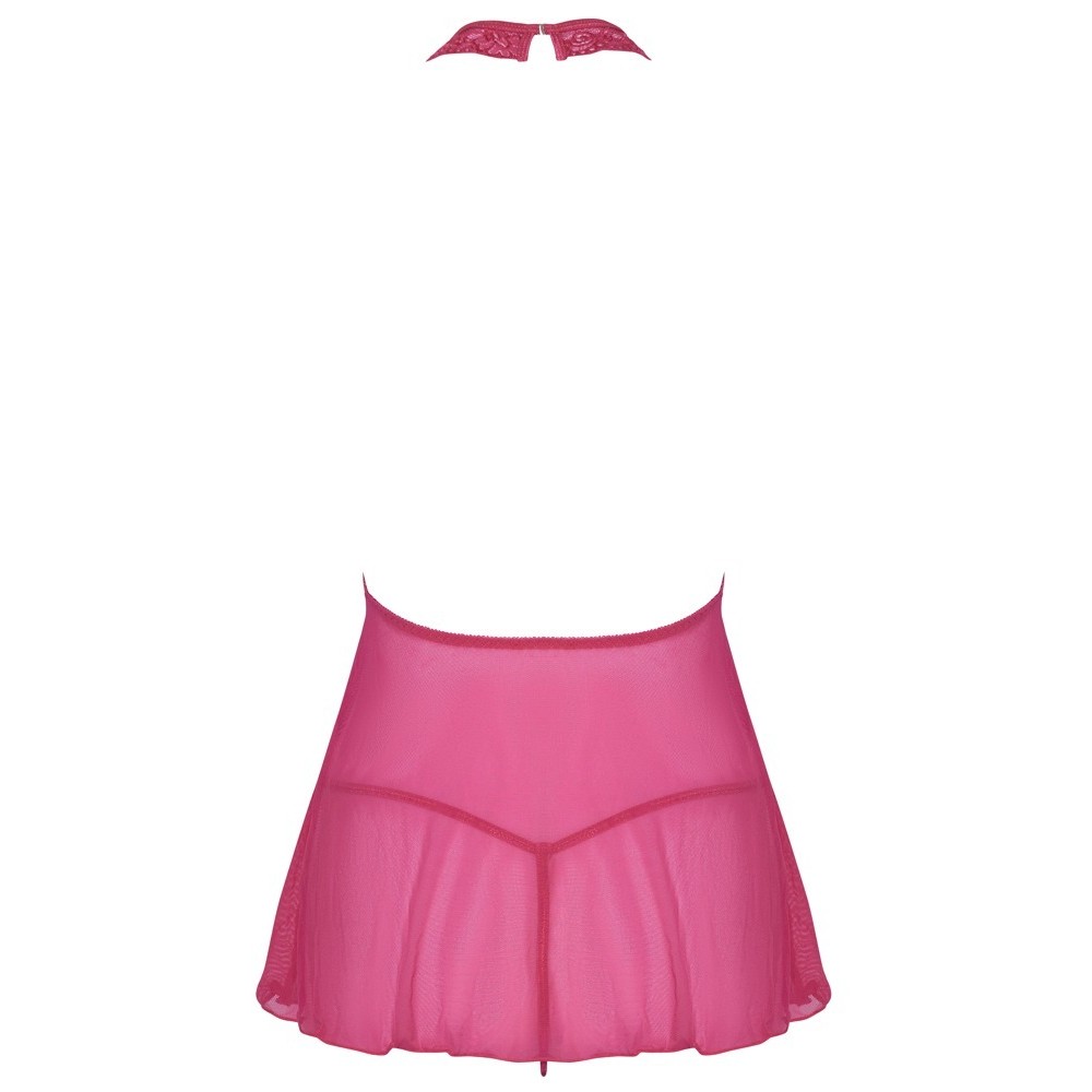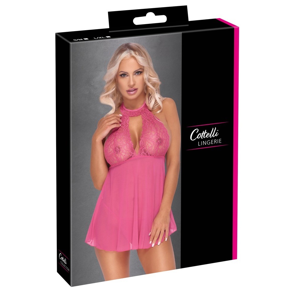 Short nightdress by Cottelli LINGERIE in sheer pink, made of fine lace at the top and powernet at the skirt. Soft and stretchy for high comfort when wearing. The front features a deep teardrop neckline under the lace halter. Backless design with halter neckline and fastening at the back of the neck. Includes matching thong.