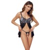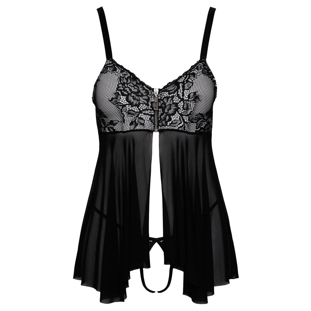 Short, flowing nightdress with crotchless thong, in a set from Cottelli LINGERIE. Completely open at the front, it has a full-length zip between the white cups covered with delicate black lace. The straps are adjustable for a perfect fit. The thong with elastic cord seduces with its open crotch.