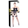 The corset is made of shiny black vinyl, is sensual and fitted, and has seductive details and removable straps.