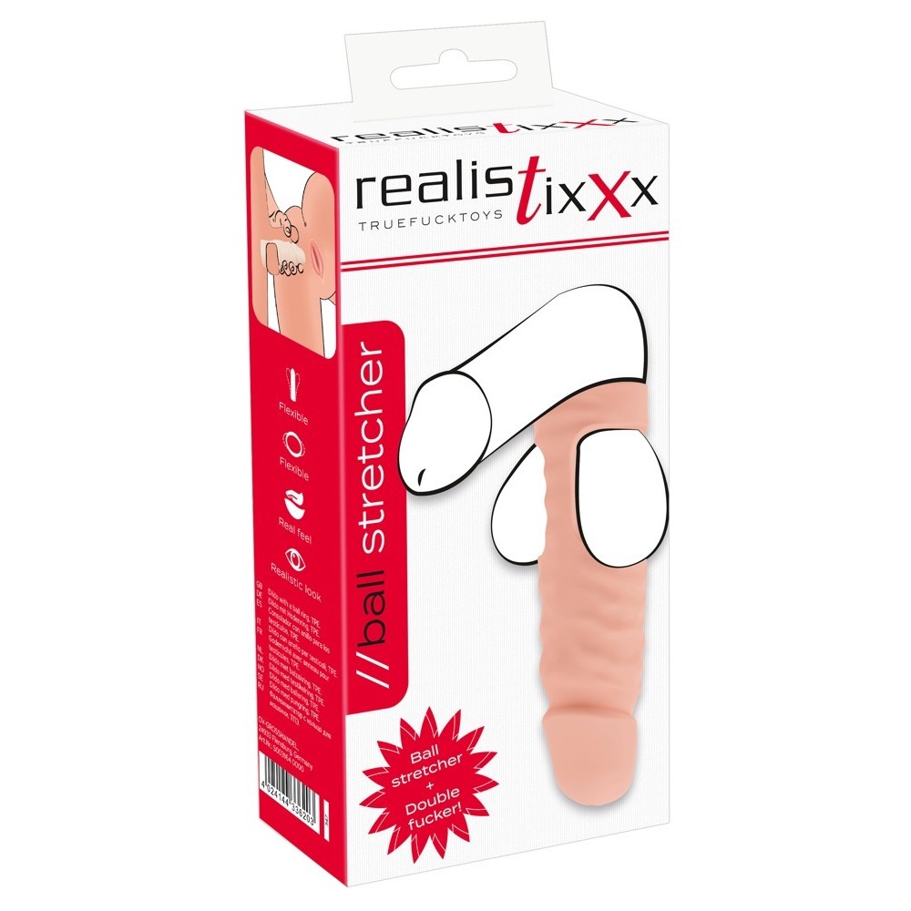 The Ball Stretcher from Realistixxx includes a dildo, providing a second stimulation for more intense experiences. This clever strap-on is placed by passing the wide ring under the testicles (preferably shaved) to the base of the penis, and then the testicles are pulled through the side openings.