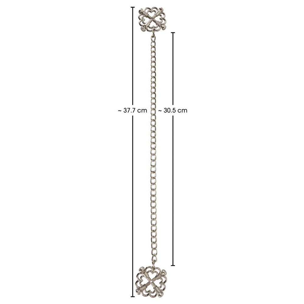 Bad Kitty's metal chain nipple jewellery consists of two clamps firmly connected by a chain. This breast jewellery is made entirely of stainless steel. The elegant clamps hold the nipples in place with four adjustment screws, allowing you to vary the pressure from gentle to firm. The chain adds a pleasant tug, making the experience as seductive as the look.