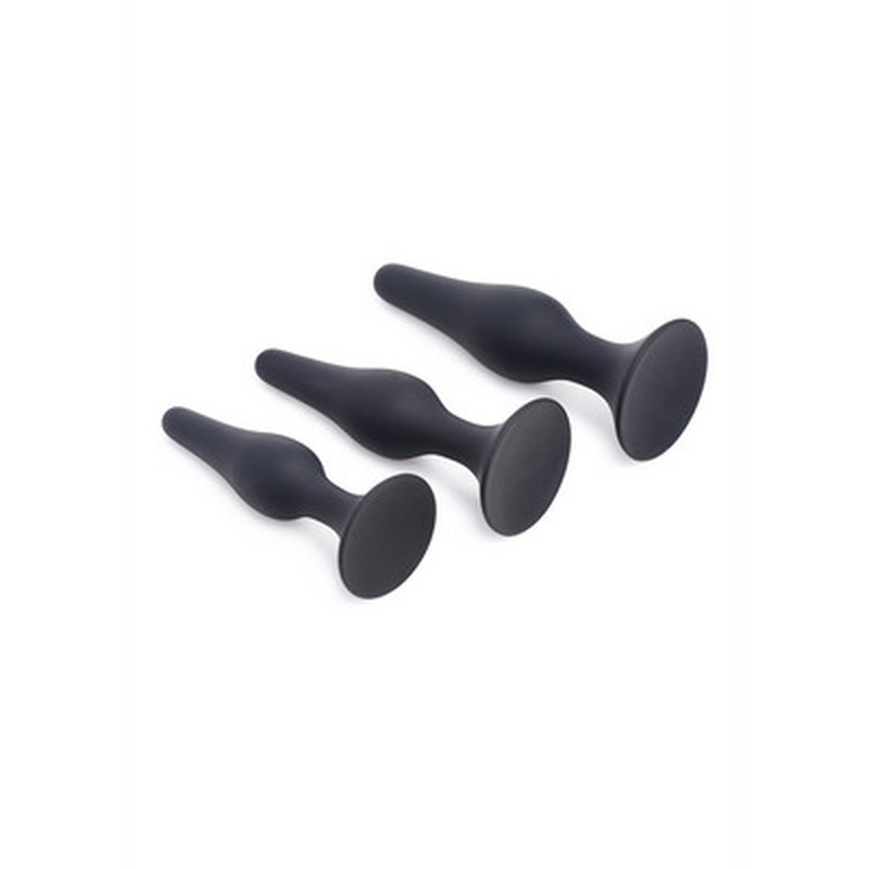 Set of tapered silicone anal plugs with suction cups, perfect for comfortable anal pleasure training.