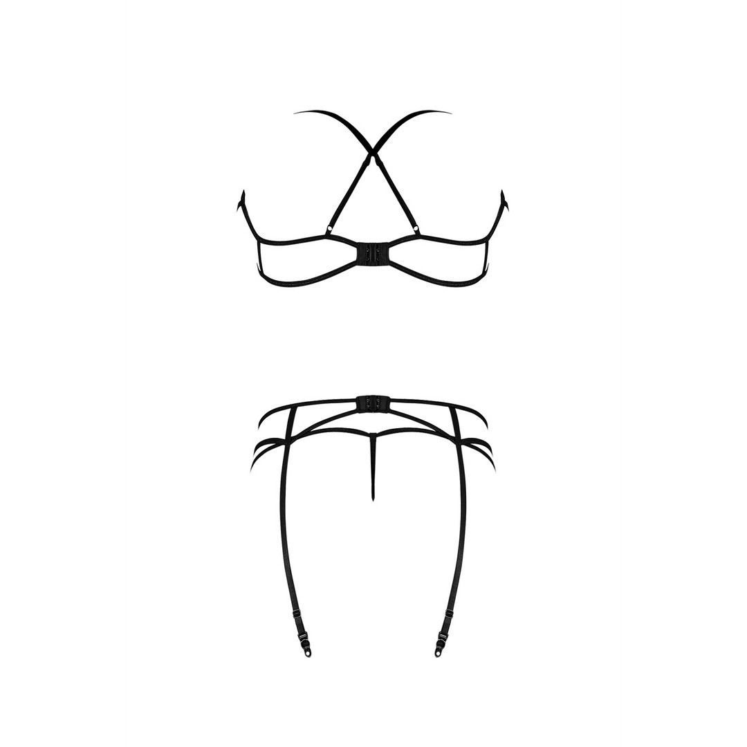 3-piece set with open cups, sensual straps and metallic U-shaped details.