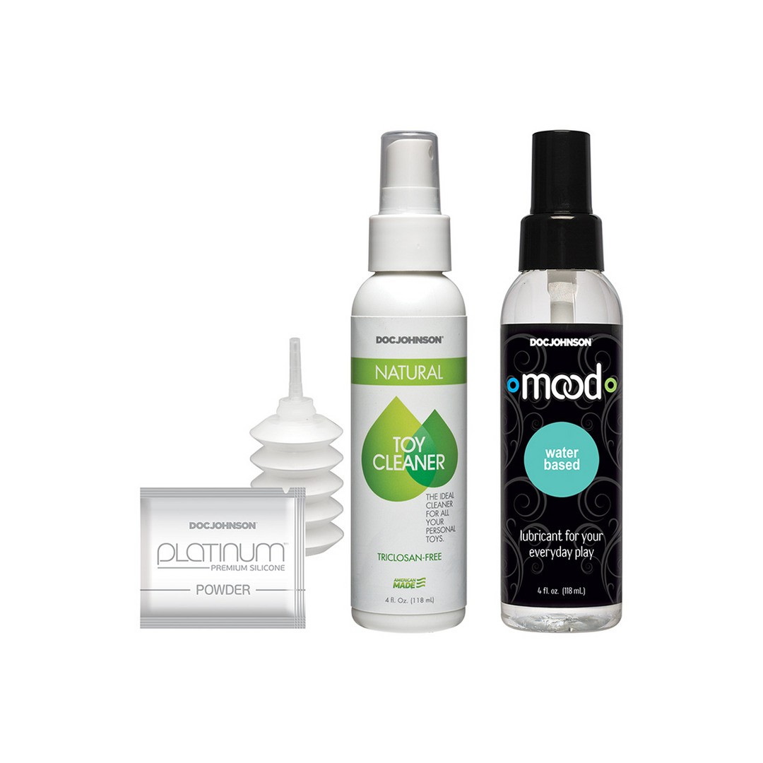 The Vac-U-Lock Silicone Pegging Set also includes Doc Johnson Natural Toy Cleaner and ULTRASKYN Refresh Powder for proper and hygienic maintenance of your dual-density ULTRASKYN accessories.
