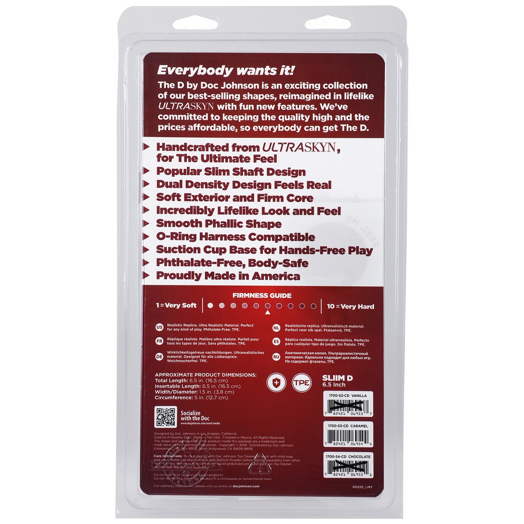 The Slim D, one of Doc Johnson's most popular models, features a comfortable width for most bodies and is available in two options: FIRMSKYN™, for a firmer feel, and dual-density ULTRASKYN™, which warms to the touch, with a soft exterior and firm core that replicates the real feel of a penis.