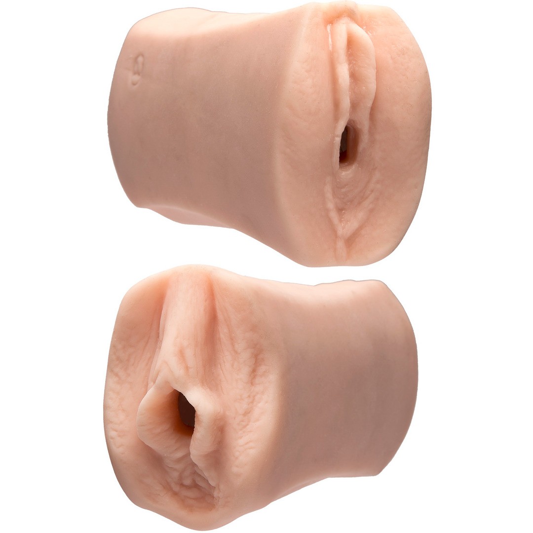 Jessie Andrews & Julia Ann double-ended ULTRASKYN masturbator, with two realistic vaginas and textured interior, body-safe.