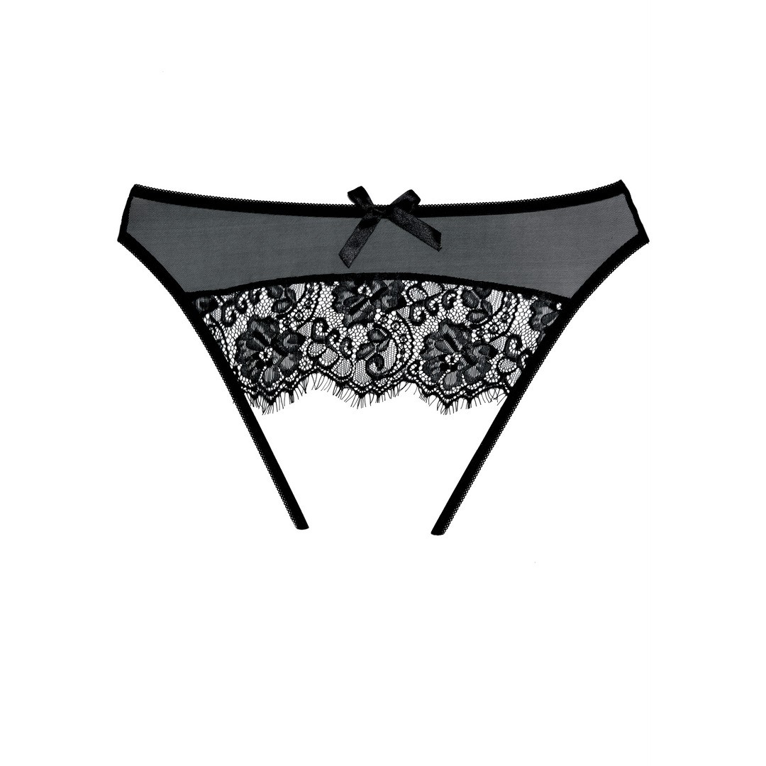 Hidden desires revealed in this seemingly secretive sheer mesh crotchless panty, with eyelash lace caressing the ouverte derriere. That it is topped with a bow is a wink of sweet, sprinkled over a flow of naughty.