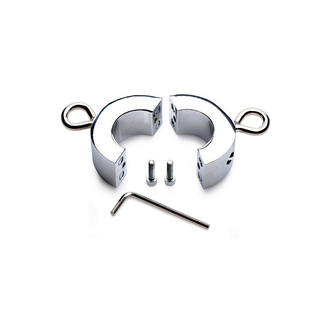 The Ball Trap is a metal ball stretcher, ideal for BDSM lovers who enjoy testicular stimulation games. Weighing 220 grams, it is designed to gently pull the scrotum, providing an intense and unique sensation. The ring has two attachment points that allow you to add weights or accessories, making it the perfect base for creating different scenarios during play. Punish your submissive for bad behaviour with additional weights or attach chains to the ankle cuffs to force them to kneel.