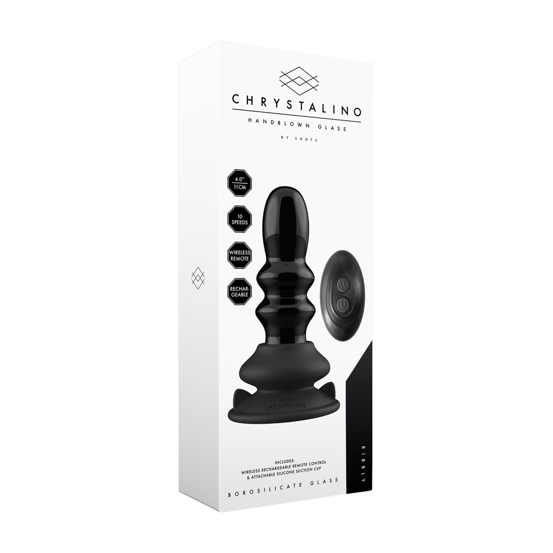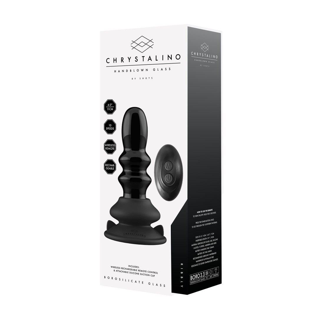 Chrystalino glass anal plug with 10 vibration modes, suction cup base and wireless remote control.