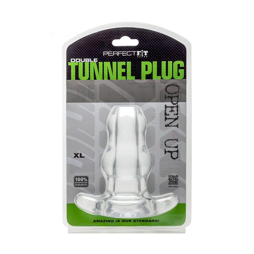 Double Tunnel Plug by Perfect Fit, with two tapered plugs and a hollow tunnel for creative penetration, ideal for experienced players.