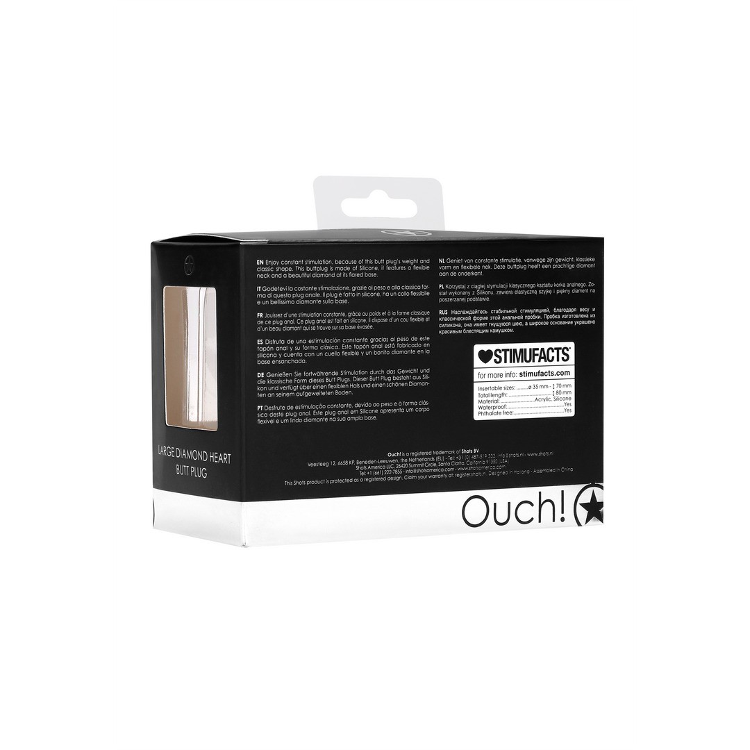 Discover elegant pleasure with the Ouch anal plug, made of soft silicone and featuring a stunning heart-shaped diamond.