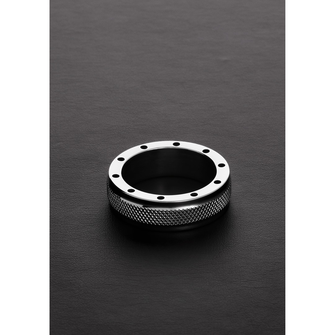 Stainless steel serrated penis ring, 4,5 cm x 1.5 cm, with 11 ventilation holes for intensity and freshness.