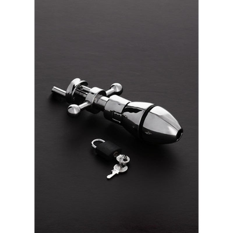 The Anal Lock Ultimate Asslock creates a new dimension in anal pleasure. Made of high-quality stainless steel, when inserted, the user feels the steel run through every inch of the cavity. When fully inserted, a simple push on the back expands the inserted part. It can be locked with a padlock for added security, functioning as an anal chastity device or anal plug. Designed for advanced players, the inner diameter is 4.3 cm when folded inwards and 5.9 cm when expanded outwards, with an insertable length of 10.9 cm. Easy to clean, it is part of the Shots Steel range.