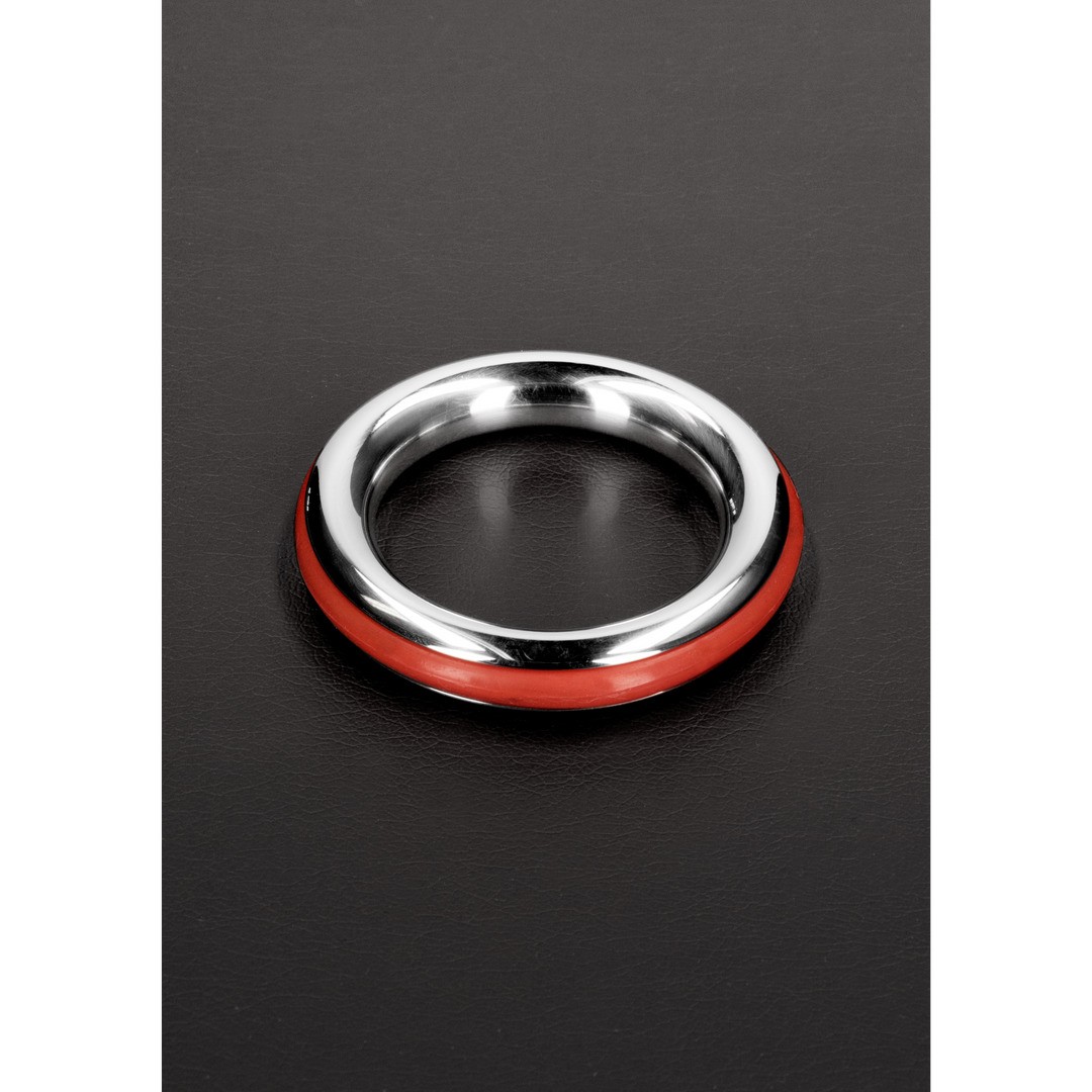 Stainless steel cockring with coloured silicone to prolong erection and add style.