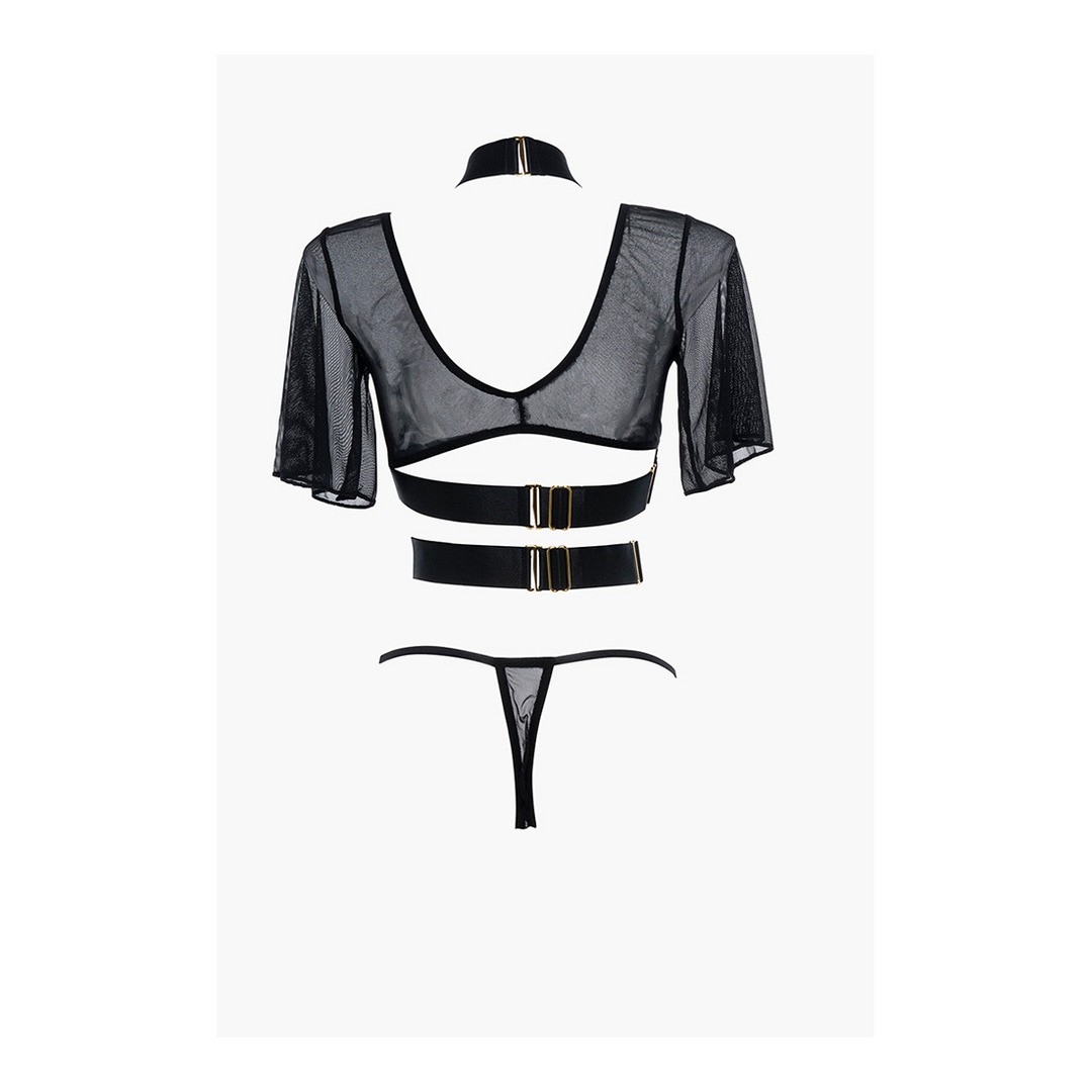 Unabashed design of teasing pleasing, offers minimal coverage with maximum results. The sheer mesh top is fused with edgy thick strapping to make this a shockingly sexy yet whimsical piece. Adjustable back hook opening. Comes with a sheer mesh thong.