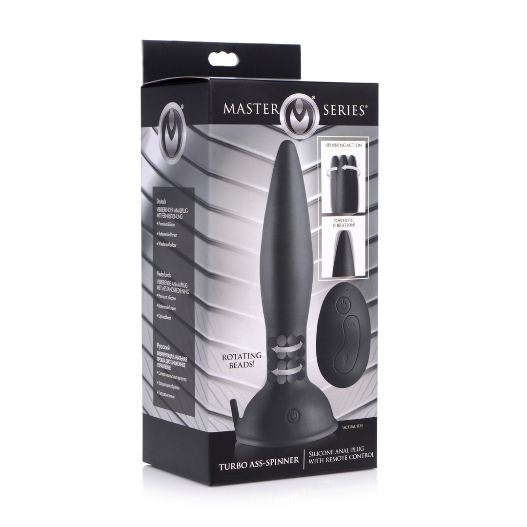 Anal plug with remote control, powerful vibration and rotation, suction cup base and safe silicone for versatile and comfortable pleasure.