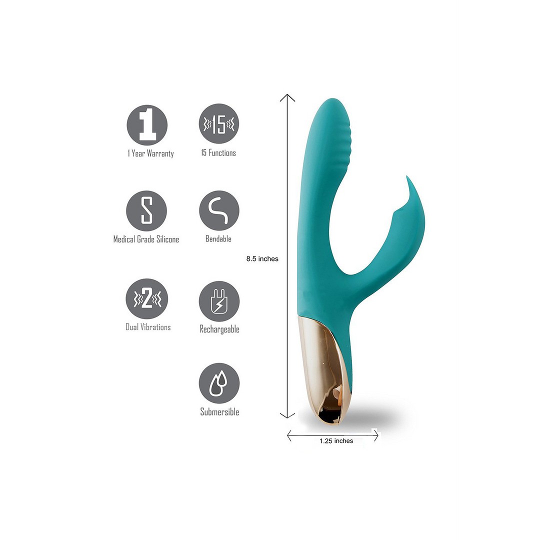 This vibrator has two independent motors, each with 15 vibration functions and progressive intensity. It's fully rechargeable and coated in 100% body-safe silicone. For fun in the water, Skyler is completely submersible.