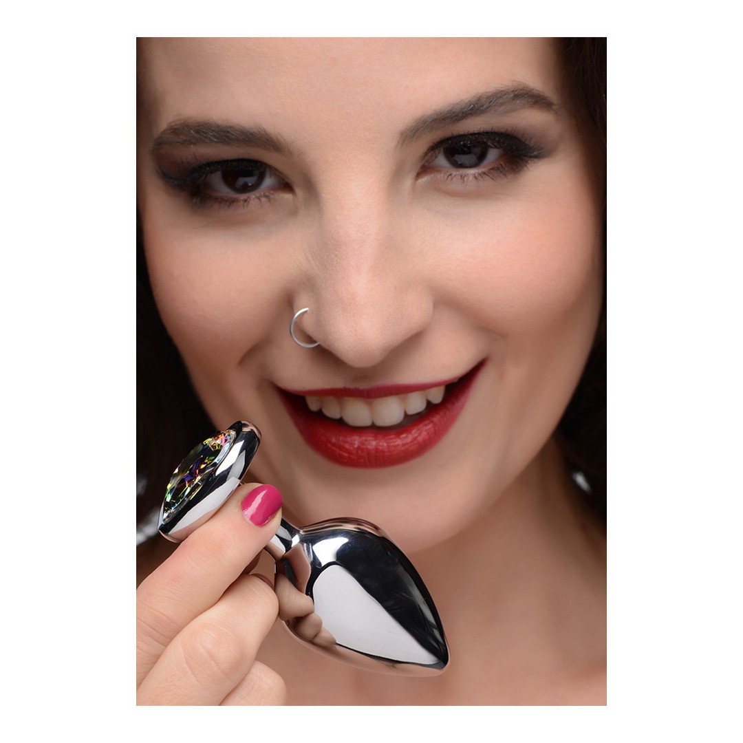 Adorn your backside with the heart-shaped Rainbow Prism anal plug! The multicoloured heart-shaped jewel adds a touch of luxury and boldness to your bum, while its compact size and satisfying weight make this shiny plug perfect both as the star of the show and for a delicious warm-up session, ideal for those who already have some experience in anal play.