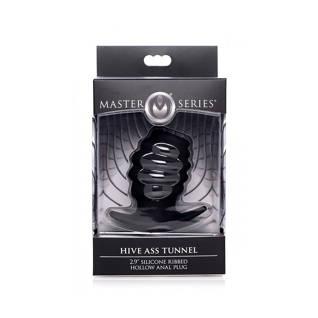 Hollow anal plug with ribs and internal tunnel for versatile pleasure. Available in three sizes and made from body-safe silicone.