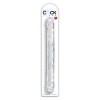 The 18-inch King Cock Clear double dildo is shaped like a penis and features a pronounced glans and veins at both ends.