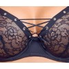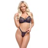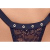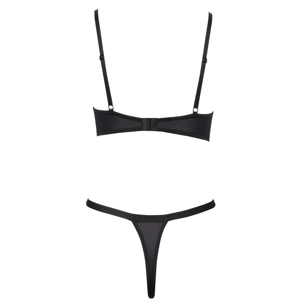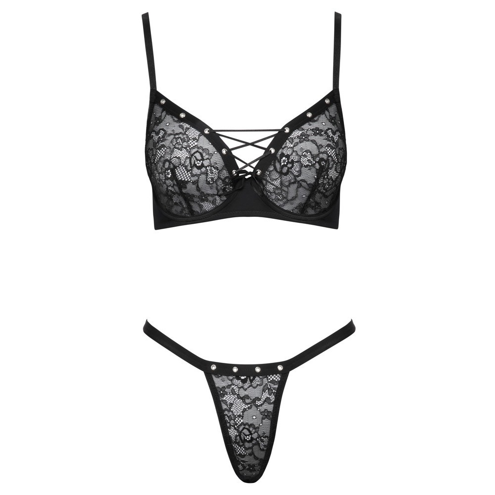 The underwired bra and thong is a black set from Cottelli LINGERIE. The cups and the front of the thong are made of elastic lace and also have decorative silver eyelets. Between the underwired cups, there is a little decorative lace. There is a hook fastening at the back of the bra for adjustment. The straps can also be adjusted for a perfect fit.