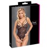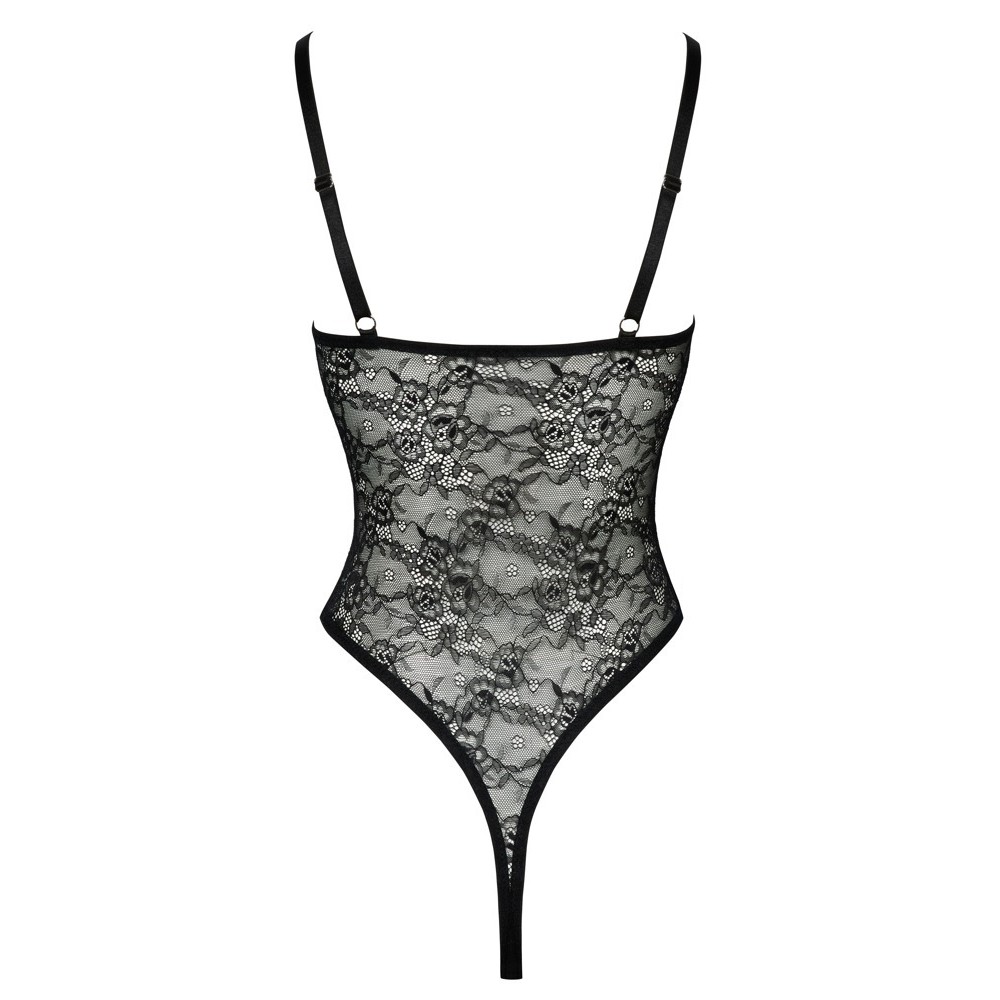 Cottelli LINGERIE strapless teddy in fine, soft and stretchy black floral lace. With elegant, stretchy straps and decorative silver rings at the neckline. The straps can be adjusted to fit. The extra high cut legs show off your bottom and legs to their best advantage. Seductively open over the mons veneris and groin.