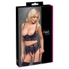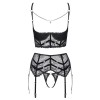 A deep-cut bra, garter belt and crotchless thong combine to form an elegant and erotic set from Cottelli LINGERIE. All pieces are made of soft, delicate and stretchy black lace, with velvet straps and silver ring details.