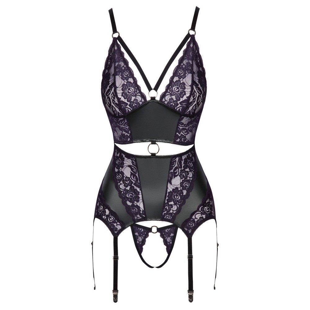 Corset and thong without crotch in a set from Cottelli LINGERIE. Made of matte black material with lace inserts on the front in an elegant dark purple colour. The set is soft and stretchy, which means it is extremely comfortable to wear. There are decorative elastic straps and a ring between the soft lace cups. There is also a silver ring above the cut-out at the front of the waist. There is also another ring at the waist of the thong. The bra straps and the 6 suspender straps are adjustable. The double hook fastening at the back is also adjustable. The small thong is seductively crotchless.