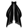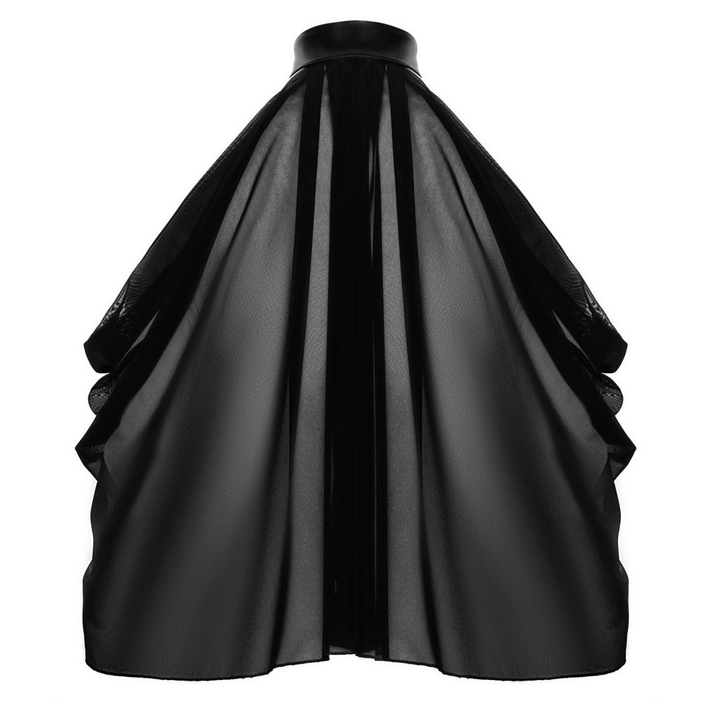 Wide and loose top from Noir, made entirely of delicate, black and transparent tulle. Cold shoulder cape style with a choker-style neckline that is made of a wet look fabric. It has press studs on the front of the neckline. Asymmetrical cut: short at the front and open, the arms and back are covered.