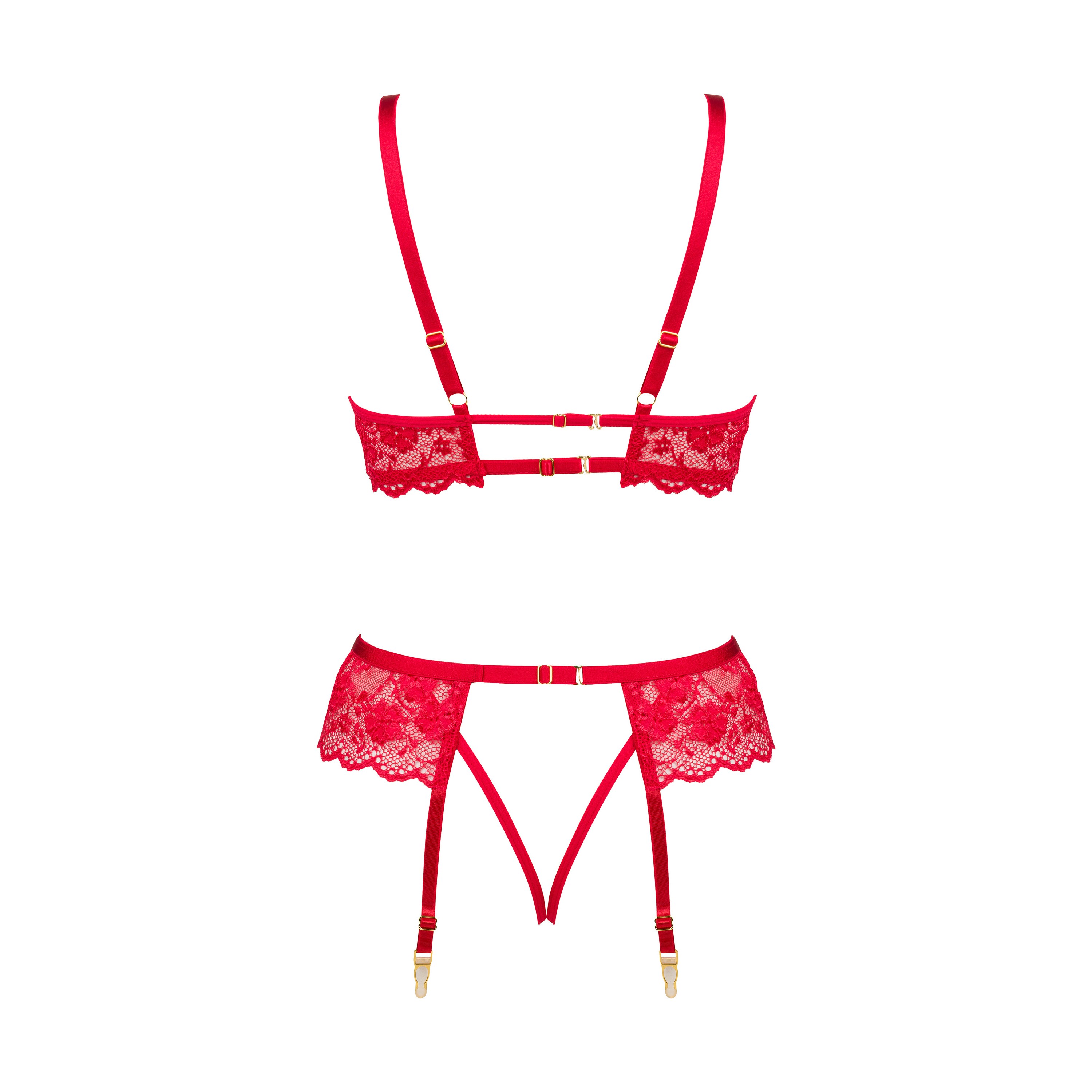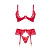 A classic lingerie set in red, consisting of a bra, panties, and a garter belt.