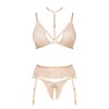 A classic lingerie set in a nude color, consisting of a bra, panties, and a garter belt.