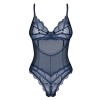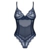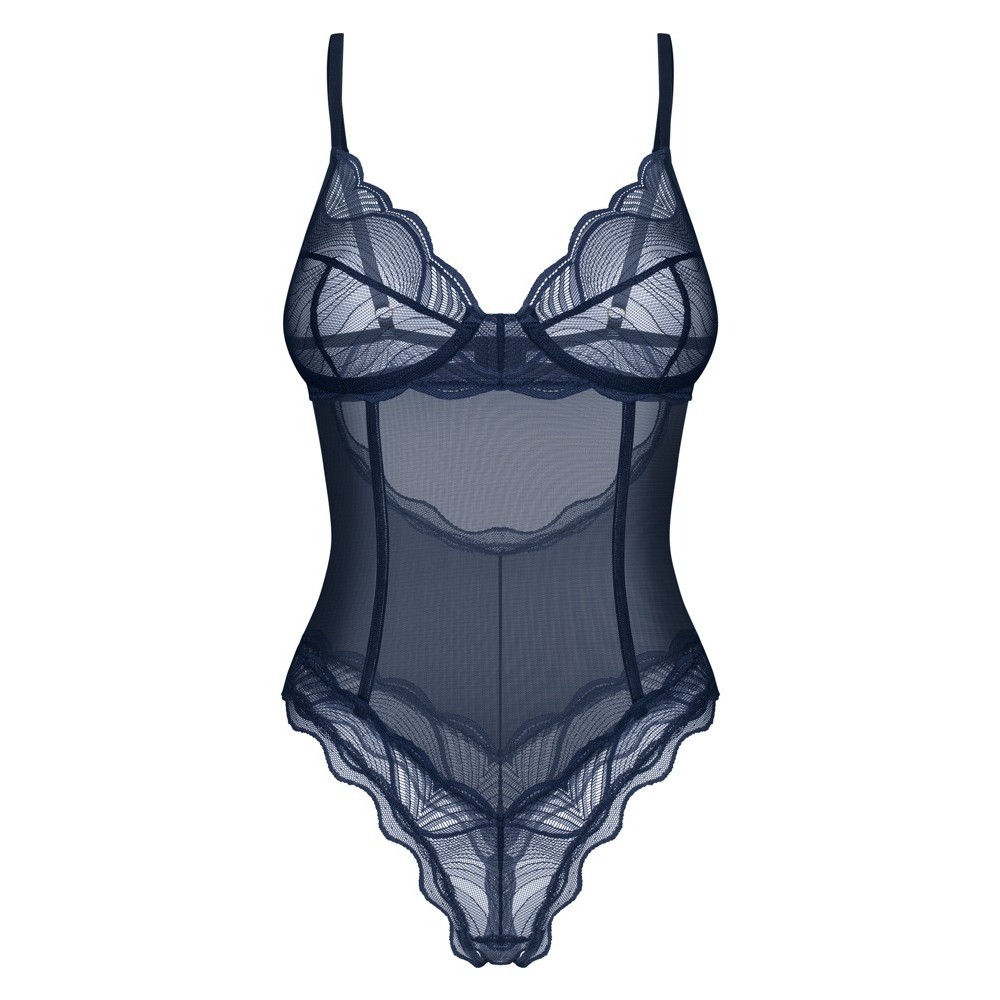 The transparent crotchless body, Nightly Blue from Obsessive, is in an elegant blue-in-blue colour. It is soft and stretchy with a delicate lace look. It also has wireless cups for a beautiful cleavage area. The straps and the hook fastener over the uncovered back can be adjusted to fit.