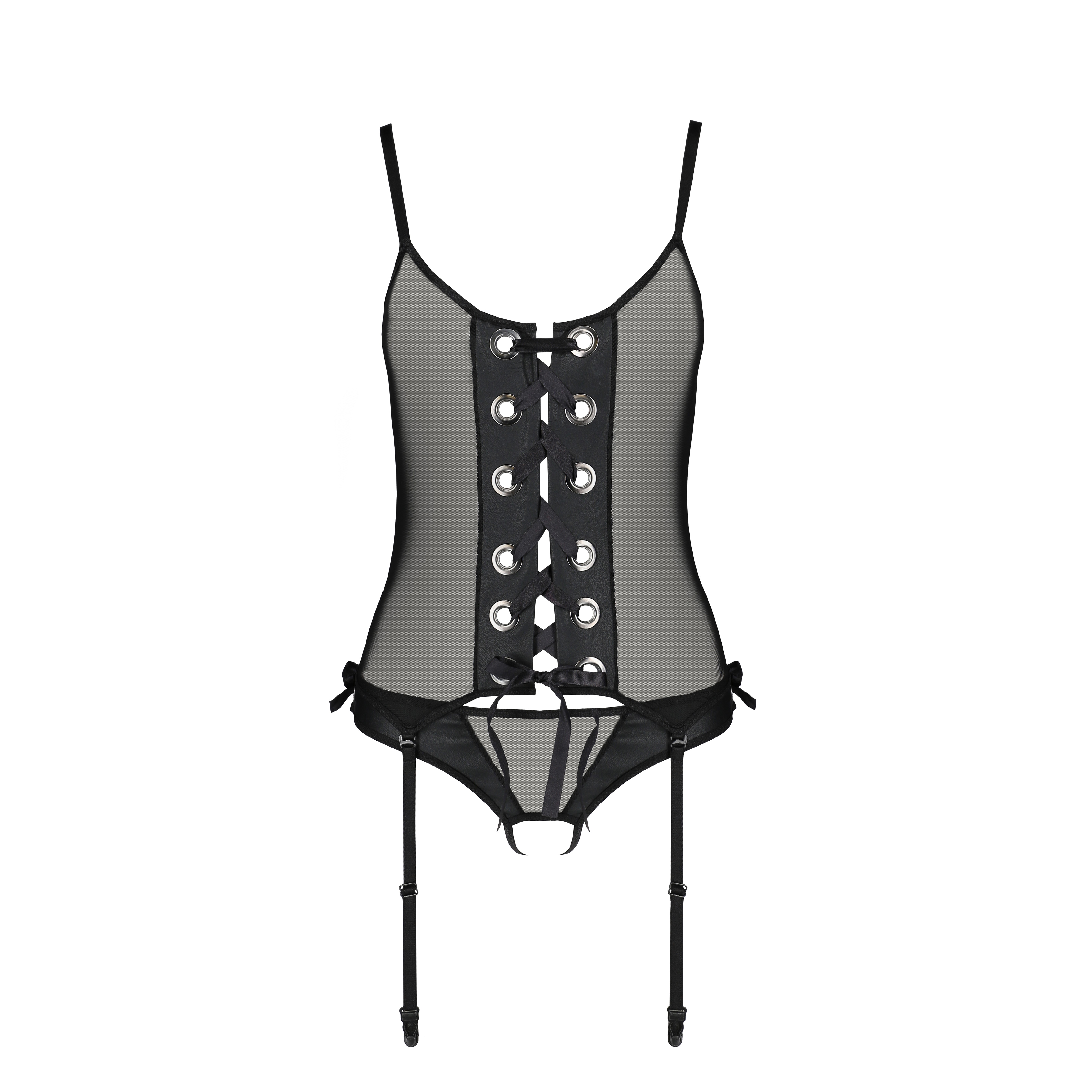 Decorated with elegant rings through which the adjustable ribbon passes, the corset takes on a sensual interweaving that gives it a unique and seductive touch.